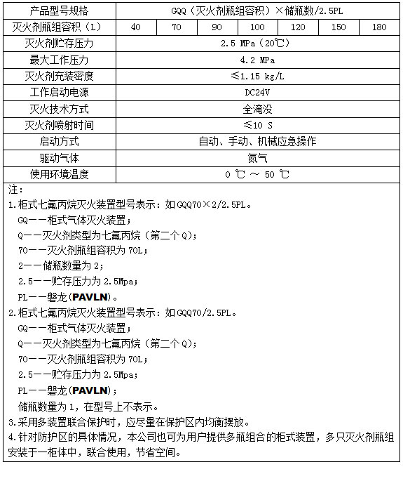 柜式七氟丙烷灭火装置也称为无管网灭火装置、预制灭火装置,由灭火剂瓶组、容器阀、电磁型驱动装置、金属软管、信号反馈装置、喷嘴、柜体等组成,不需安装灭火剂输送管道,不需设置专用的储瓶间。装置设置在防护区内,当火灾发生时,直接向防护区喷射灭火剂,灭火剂无管路损失,灭火速度快、效率高。装置具有自动、手动两种启动方式。
