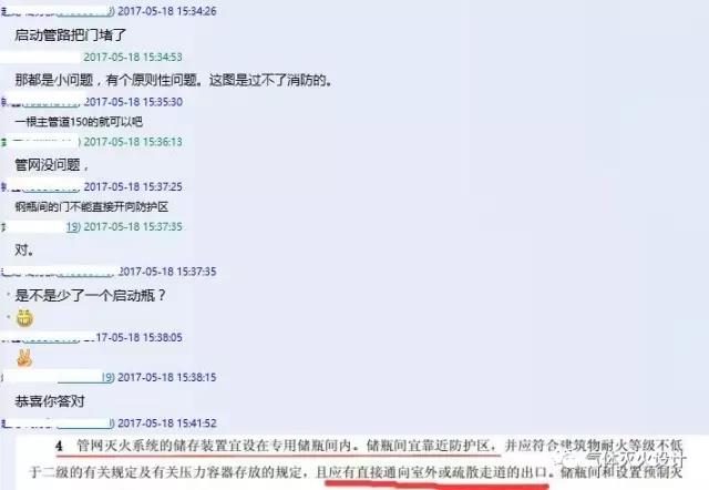 从讨论的过程中看,很多人都忽略了钢瓶间的要求。从图纸看,钢瓶间只有一个门,门开向防护区,试想如果发送火灾,联动控制系统不起作用,需要机械应急启动的话,人员能从发送火灾的防区进入钢瓶间吗?