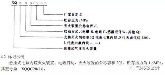 根据《悬挂式气体灭火装置》GA13-2006的第4条规定,七氟丙烷悬挂式灭火装置的命名规则为XQQ开头。详见以下截图示例: