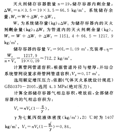 选定灭火剂储存容器规格及数量,灭火储存容器选用90L的ZJ-90储存容器,充装率 ≤1150kg/m3,暂定为700kg/m3,钢瓶数