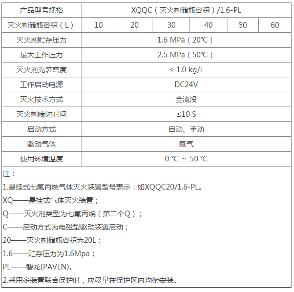 悬挂式七氟丙烷气体灭火装置可单独设置用来保护较小空间的保护区,也可多台联用保护较大空间的保护区。