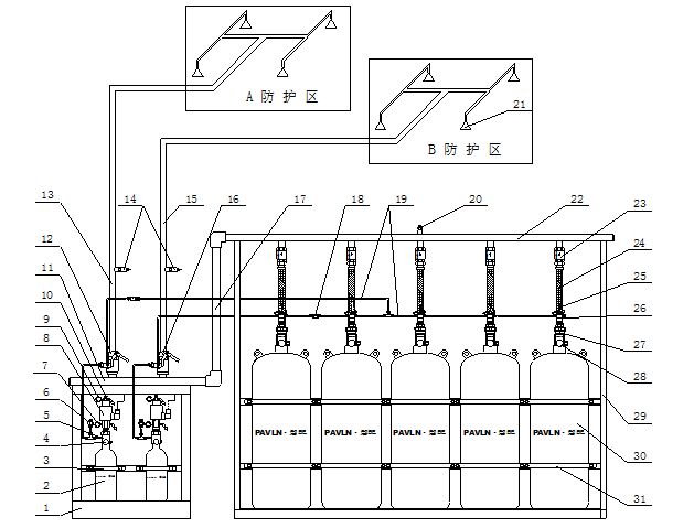 组合分配系统适用于两个以上的防护区保护,它的特点是每个防护区均设置自己的驱动气体瓶组和选择阀,而贮存灭火剂的瓶组是共用的(按最大的灭火剂使用量计算),为多区组合保护,减少了一次性投资。