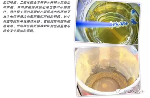 二氧化碳会溶解于水并和水反应生成碳酸,虽然碳酸是弱酸但是也有微小腐蚀性,另外最主要的是钢铁在弱酸或水的环境下发生电化学反应也就是巅峰国际 所说的锈蚀,这个反应对钢瓶来说是致命的,它轻则影响钢瓶使用寿命,重则降低钢瓶强度和密封性甚至有可能会发生爆炸的风险。