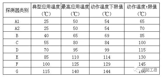 注:表中A1、A2、B、C、D、E、F、G为点型感温探测器的不同类别,其具体参数应符合下表的规定。