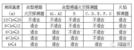 1、对不同高度的房间,可按如下表格选择点型火灾探测器。