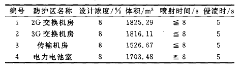 此系统共4个保护区域,每个防护区的设计参数见表1。将二层、三层的2G交换机房、3G交换机房、传输机房、电力电池室分别作为防护区,进行气体灭火设计。采用ZJ一9O型HFC一227ea自动灭火产品,防护区采用全淹没灭火,设计成一套四区的组合分配系统,具有同保护选择灭火功能(表1)。