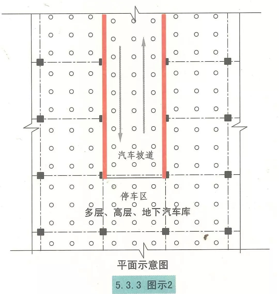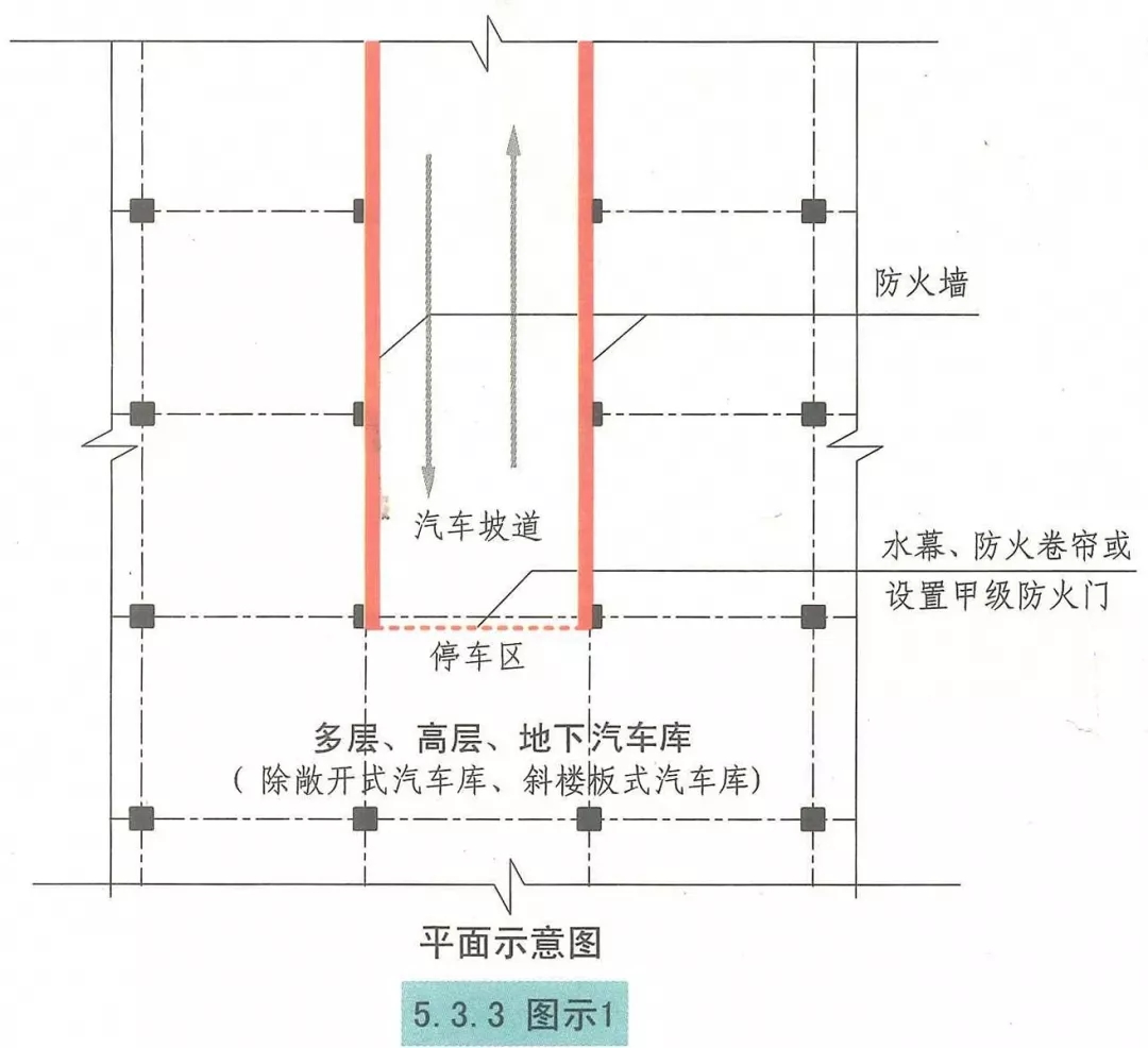 5.3.3 除敞开式汽车库、斜楼板式汽车库外,其他汽车库内的汽车坡道两侧应采用防火墙与停车区隔开,坡道的出入口应采用水幕、防火卷帘或甲级防火门等与停车区隔开【图示1】;但当汽车库和汽车坡道上均设置自动灭火系统时,坡道的出入口可不设置水幕、防火卷帘或甲级防火门。【图示2】
